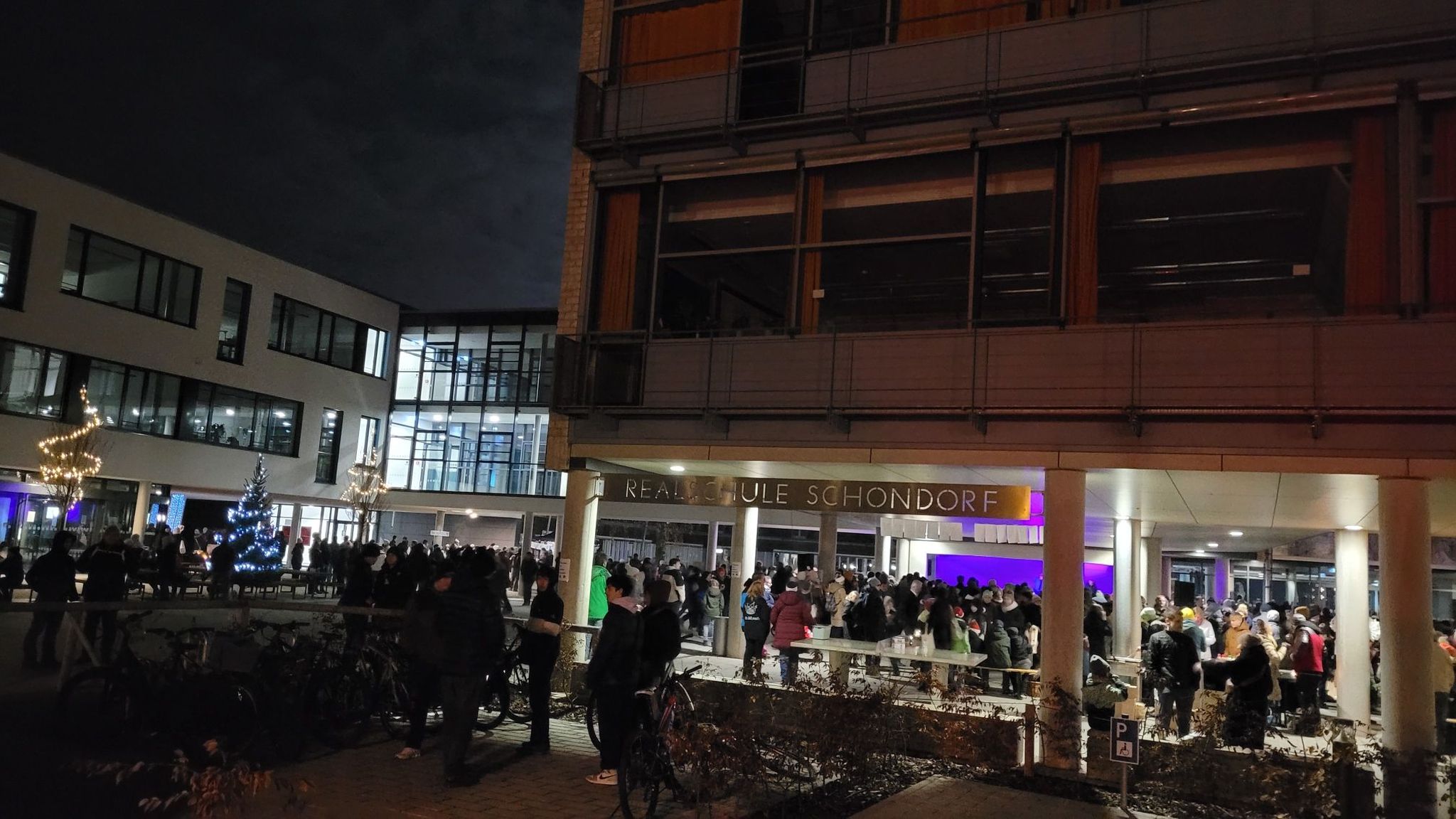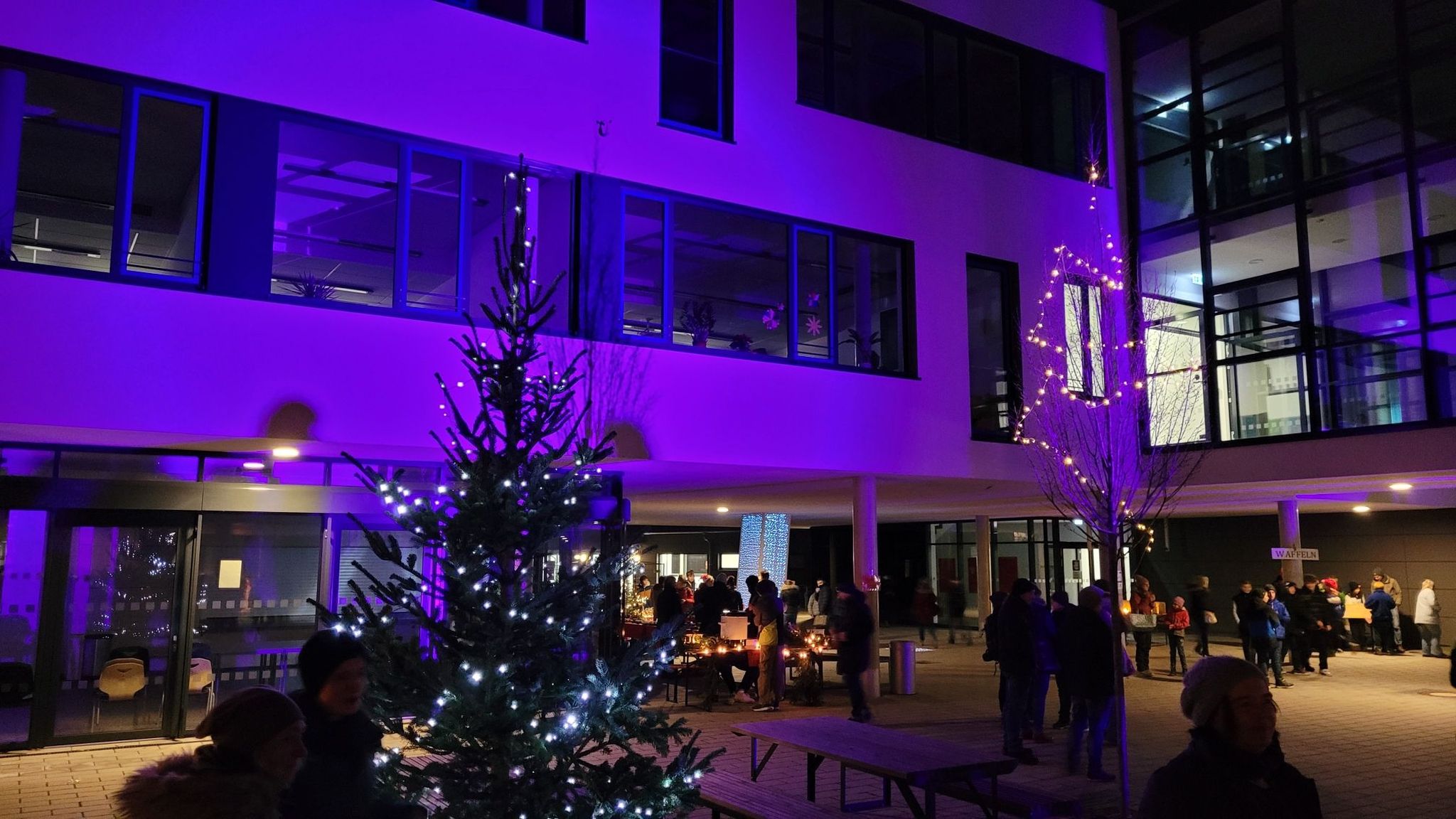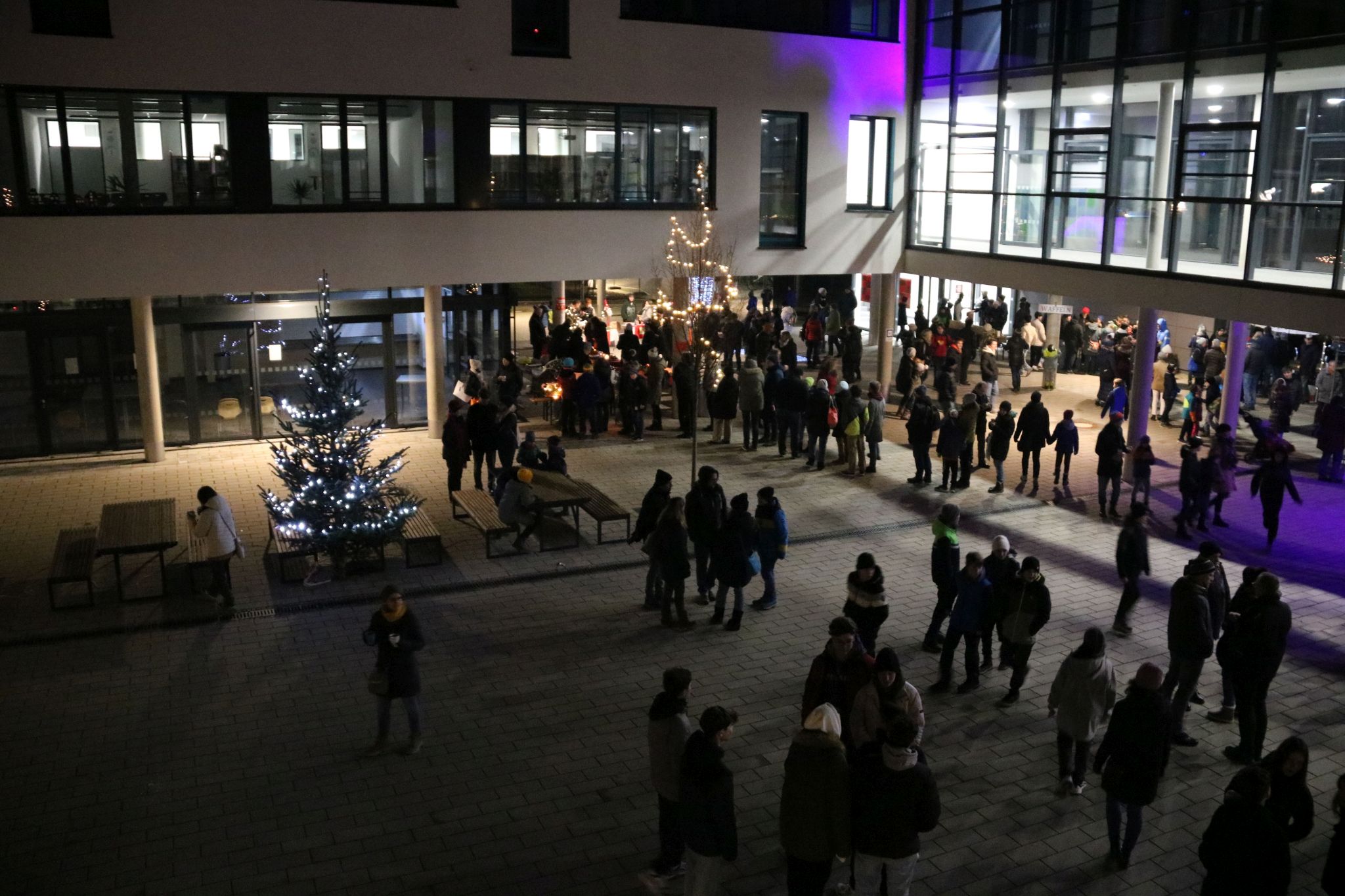 Bei der Feier, die dieses Jahr ausschließlich im Freien stattfand, boten verschiedene Schülergruppen, der Elternbeirat (mit Unterstützung der Eltern der Klasse 6a) sowie der Förderverein vor allem Essen und Trinken aber auch weihnachtliche Dekorationen an. Für Unterhaltung sowie musikalische Untermalung sorgen zahlreiche kreative Auftritte von Schülern – ob mit Instrumenten wie Percussion, Saxofon und Ukulele oder als Kinntheater, Line-Dance und Taschenlampen-Flashmob. Der Erlös soll lokalen sozialen Vereinen zugutekommen. Die Klasse 5d war so engagiert dabei, dass sie neben ihren Plätzchen, die sie teilweise als fliegende Händler an die Frau bzw. den Mann brachte, schließlich noch ein Lebkuchenhaus auf der Bühne versteigerte.Zum Ausklang kam noch einmal die Bläsergruppe zum Einsatz. Die Mitglieder der Schulfamilie und, besonders erfreulich, auch ehemalige Schüler waren sich einig: Diese Adventsfeier hat Freude bereitet – gerne alle Jahre wieder!