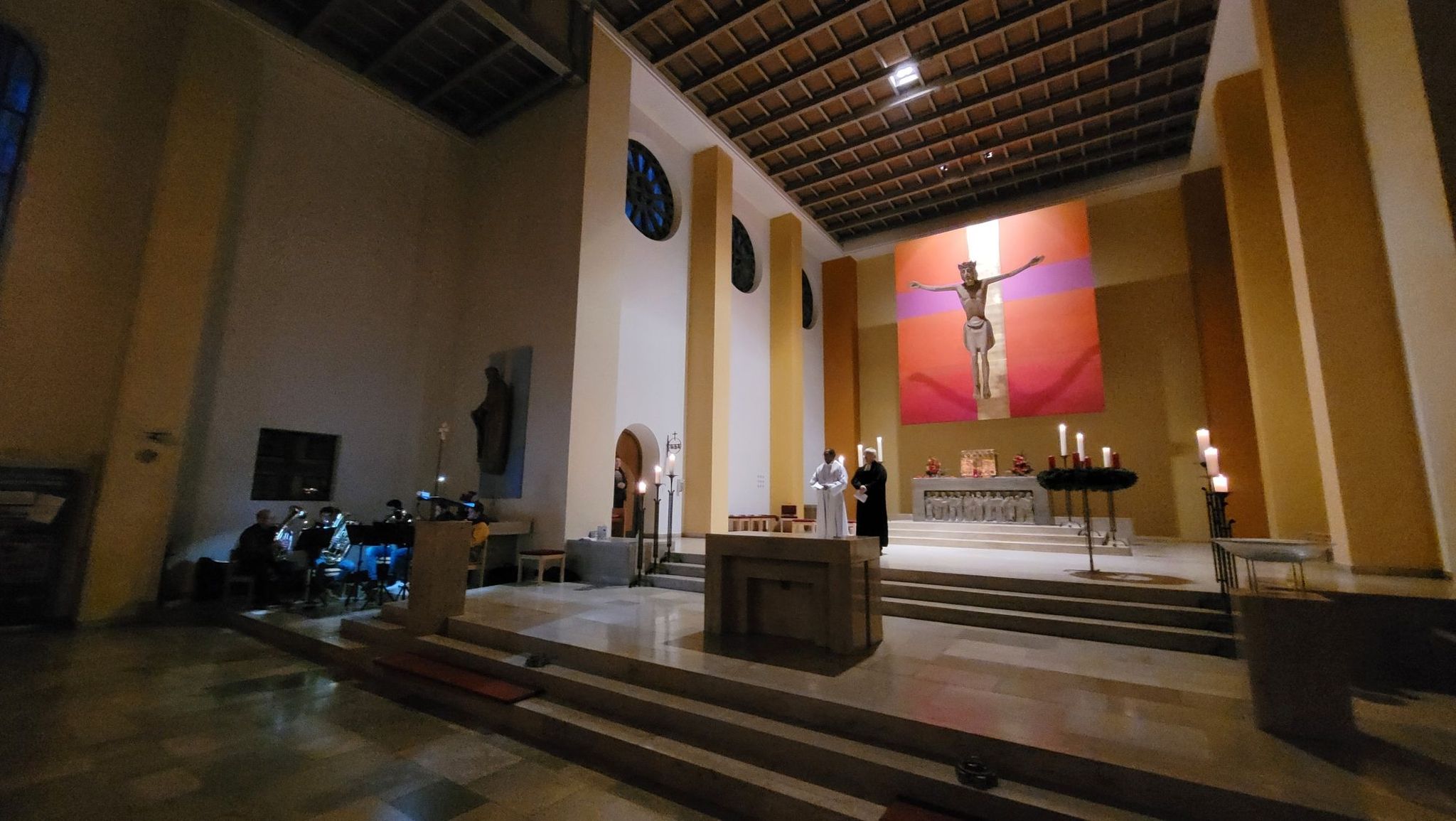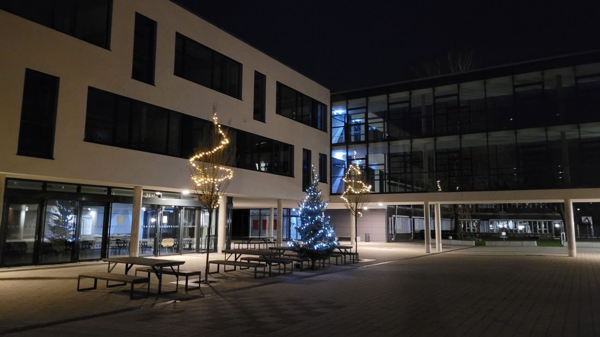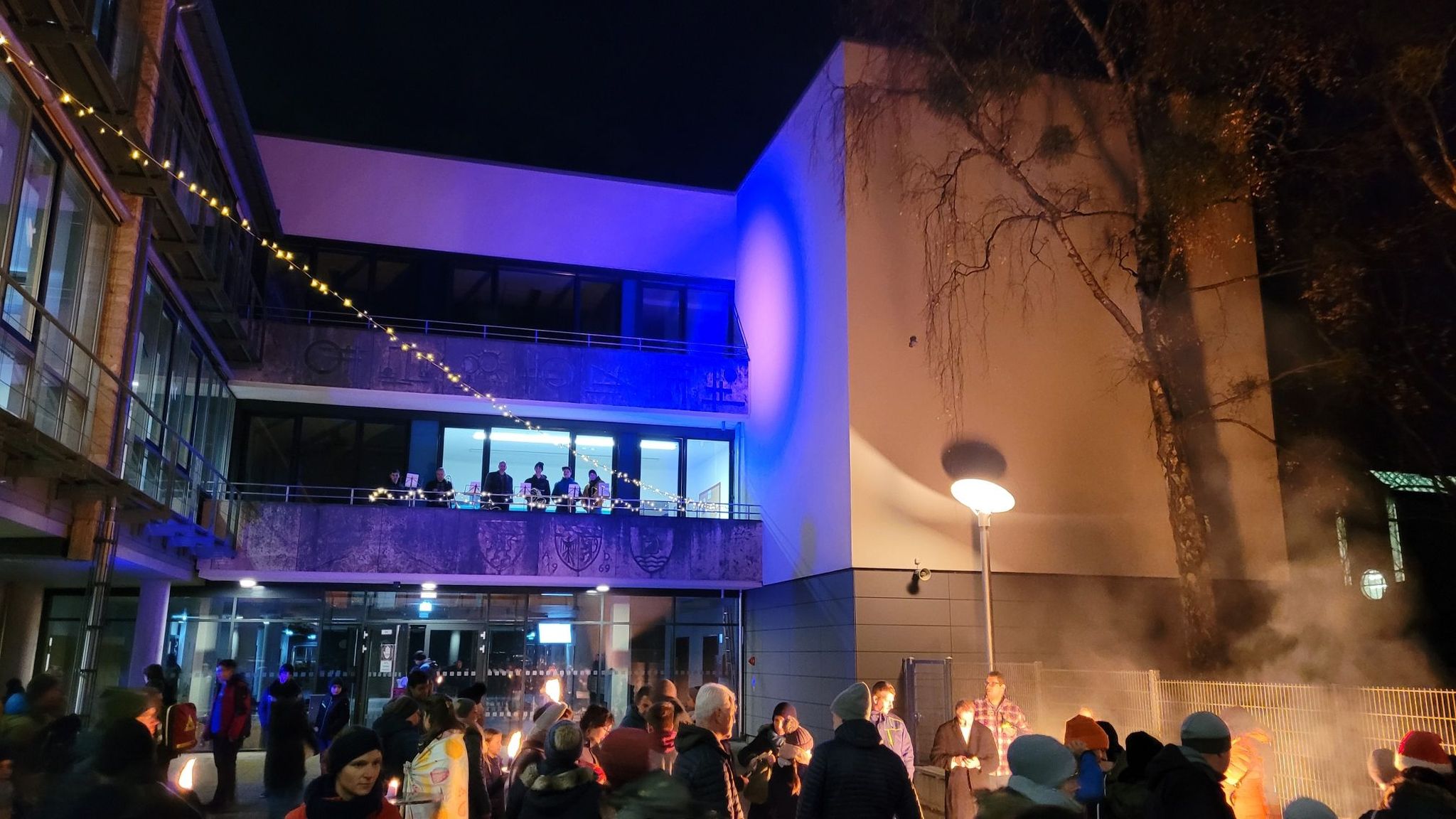 Nach zwei Jahren ohne Adventsfeier war es am Donnerstag, den 8.12.22, endlich wieder so weit. Los ging es in der Schondorfer Heilig-Kreuz-Kirche mit einer stimmungsvollen Andacht unter Mitwirkung einiger Schüler sowie musikalischer Begleitung der schulischen Bläsergruppe. Von der Kirche aus macht sich Schüler, Eltern und Lehrkräfte mit Fackeln ausgestattet auf den Weg zum Schulgelände. Empfangen wurden die weiteren Teilnehmenden mit einer Einlage der Bläsergruppe auf dem Balkon – diesmal unterstützt von Pfarrer Wnendt an der Posaune! Anschließend eröffnete Herr Morhard die Adventsfeier offiziell mit einer kurzen Ansprache.